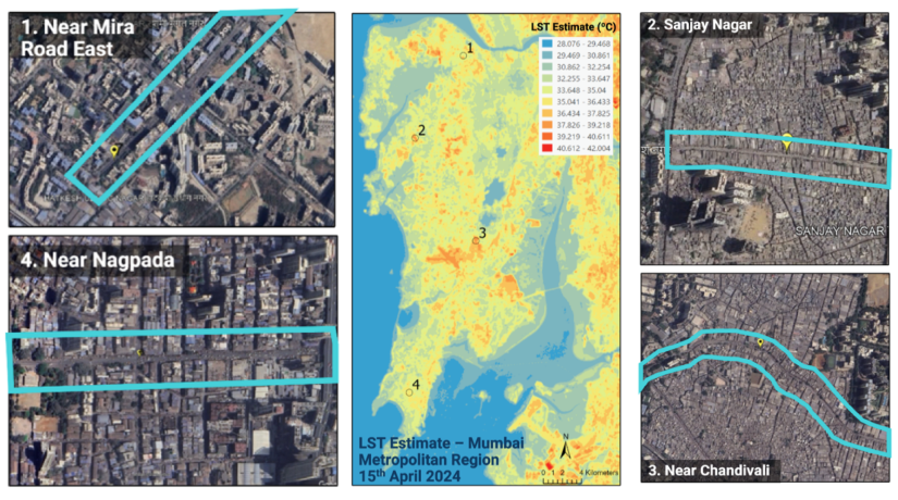 Since 2018, RMI India has been a collaborator in sustainability planning for Lodha’s Palava City, a notable development designed with features to promote heat resilience.16 Thanks to this familiarity with the site, we identified an existing main road that features many of the defining elements of a cool corridor, despite not being intentionally designed as one. As shown in satellite imagery and site photographs, this road is lined with trees and incorporates additional landscaping. Shade is provided by adjacent high-rise buildings and installed shade structures, and the street channels breezes between buildings. The map of land surface temperatures also confirms that this road’s immediate surroundings are relatively cooler than much of the broader vicinity. Lodha estimates that Palava consistently achieves land surface temperature reductions of around 2°C, with localised reductions of up to 7–11°C in vegetated and shaded areas.17