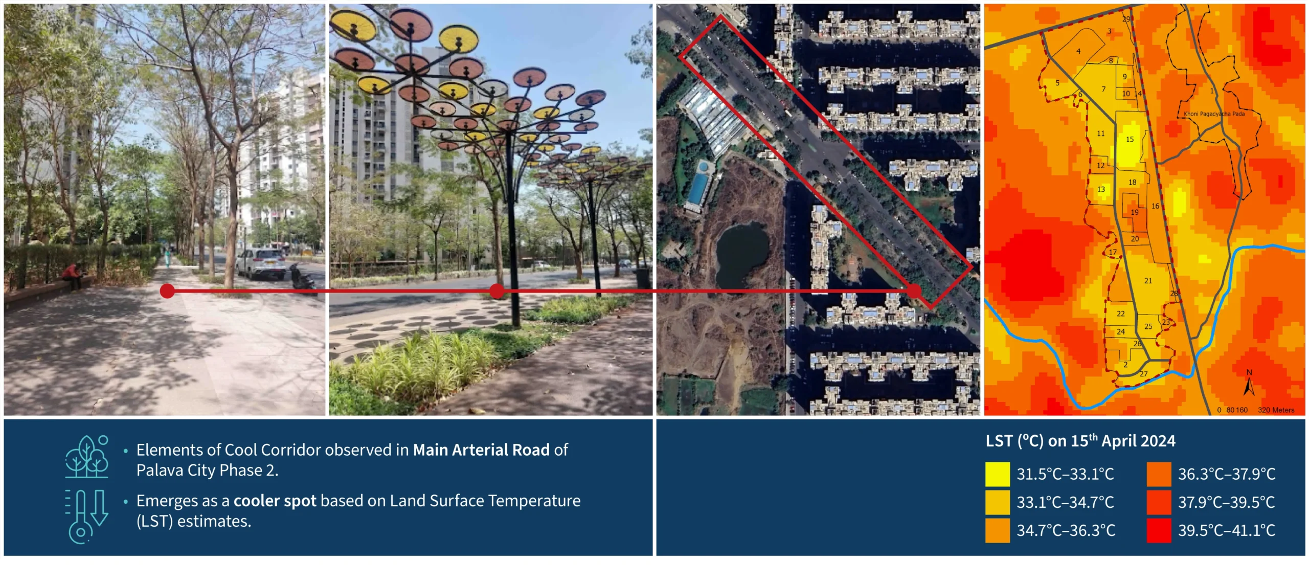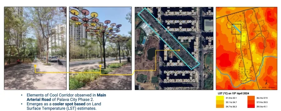 Since 2018, RMI India has been a collaborator in sustainability planning for Lodha’s Palava City, a notable development designed with features to promote heat resilience.16 Thanks to this familiarity with the site, we identified an existing main road that features many of the defining elements of a cool corridor, despite not being intentionally designed as one. As shown in satellite imagery and site photographs, this road is lined with trees and incorporates additional landscaping. Shade is provided by adjacent high-rise buildings and installed shade structures, and the street channels breezes between buildings. The map of land surface temperatures also confirms that this road’s immediate surroundings are relatively cooler than much of the broader vicinity. Lodha estimates that Palava consistently achieves land surface temperature reductions of around 2°C, with localised reductions of up to 7–11°C in vegetated and shaded areas.17
